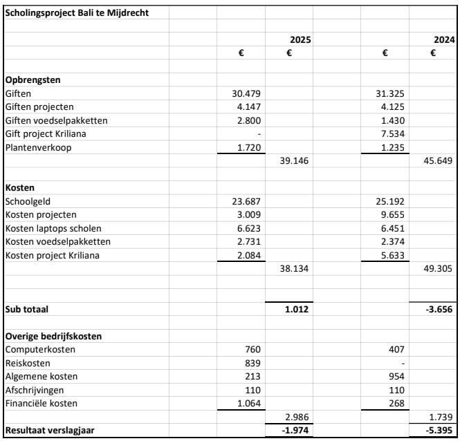 De totale uitgaven in 2025 bedroegen € 41.516,20. Het grootste deel van de uitgaven betreft de schoolkosten voor de kinderen. Deze bedroegen € 23.687,35 voor 225 kinderen.